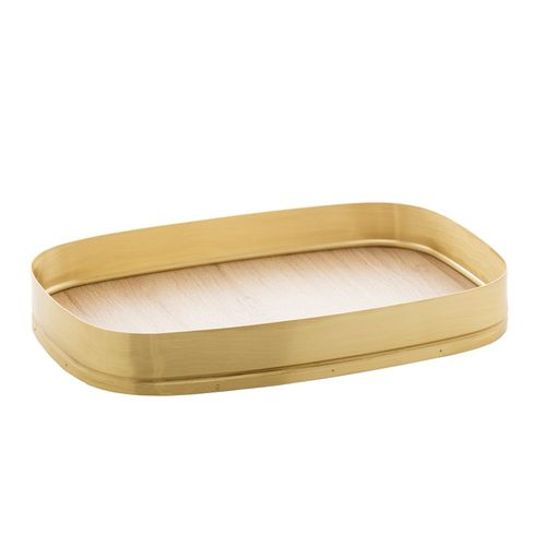 Bandeja Retangular Escovada com Fundo em Madeira Jade Dourada 38cm x 24cm