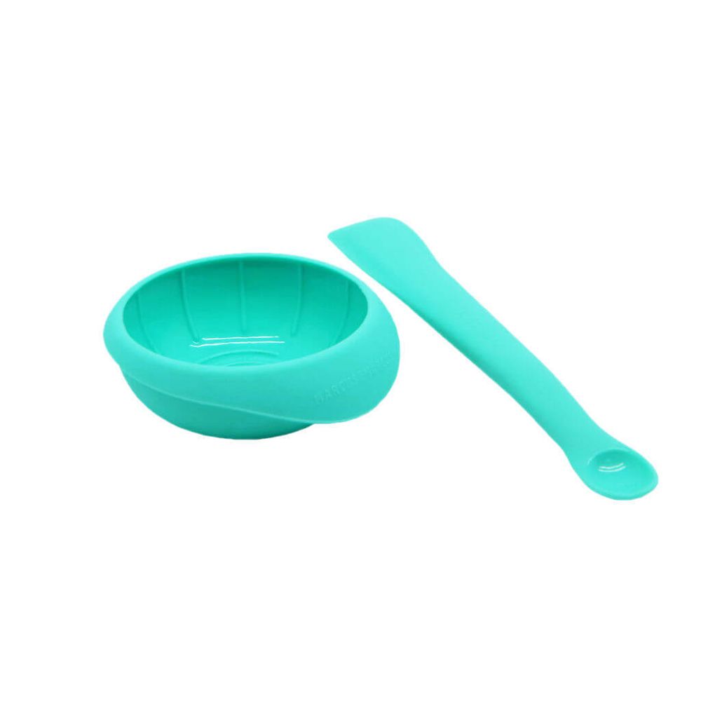 Feito de silicone, o conjunto é inquebrável e resistente. A colher possui um apoio na parte de baixo para que não encoste na mesa, evitando possíveis contaminações. Além disso, sua borda é macia e afunilada, pensada especialmente para a boquinha do bebê, sem agredir a gengiva.